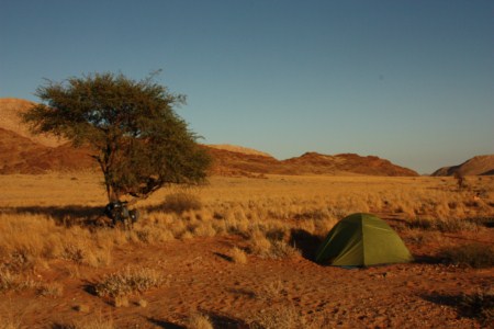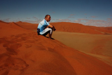 Iz glavnega mesta sem se proti centralno južnemu delu države pognal na tisoč kilometrov dolgo makadamsko cesto, ki vodi skozi narodni park Naukluft globoko v puščavo namib in raj imenovan Sossusvlei. Dnevne temperature se v tem letnem času dvignejo le do 32 in ponoči spustijo do vsega dveh stopinj Celzija. Visoke rdeče sipine, skrivnostni živalski svet, modro nebo in spokojna tišina puščave odtehtajo potenje, tiščanje kolesa , kratke dnevne etape z ne videnimi lepotami puščave namib. Da pa je bilo trpljenje prijetneje je poskrbel švicarski kolesar, ki sem ga srečal v kampu Sesrem in poskrbel, da po dve letih in pol nisem kolesaril sam.